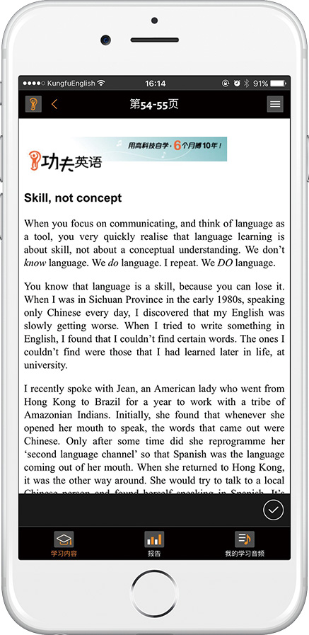 如上4个步骤完成之后,我们做最后一次的复习。 这次我们只是看英文文字,阅读 “The Third Ear”, 尽量确保自己全懂。 这时候我们也可以跟英语陪练进行对话,围绕 “The Third Ear” 内容为主题,一边提高口语,一边强化对 “The Third Ear” 内容的理解。 < 上一页 下一页 >